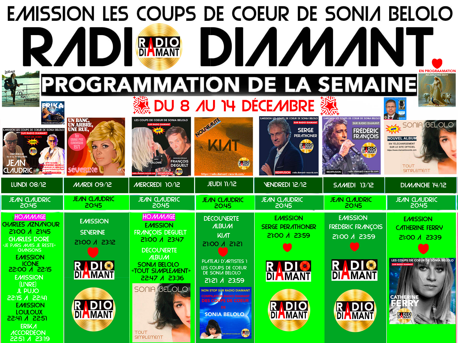 PROGRAMMATION DU 8 AU 14 DÉCEMBRE SUR RADIO DIAMANT CHRONIQUE JEAN CLAUDRIC |