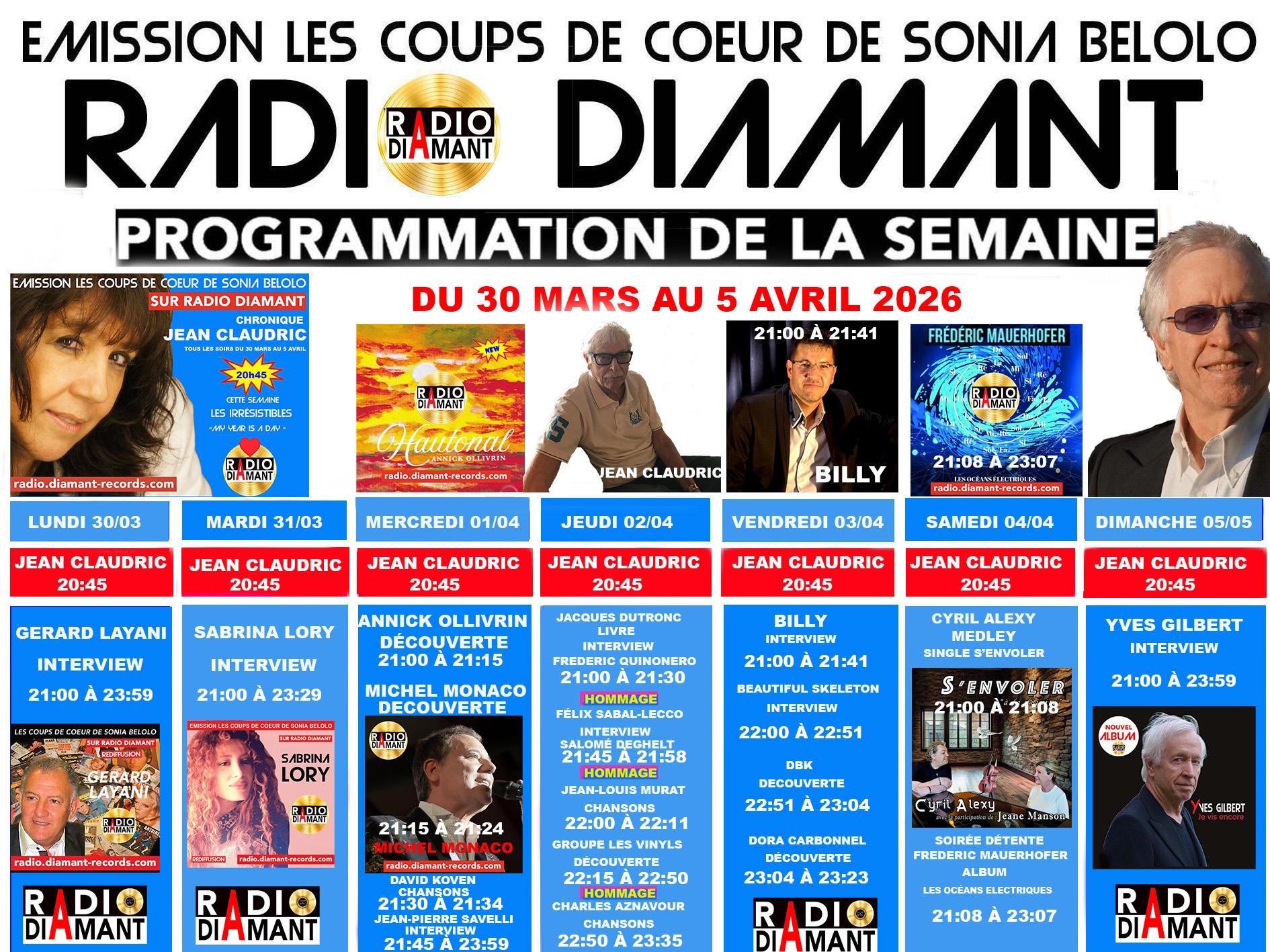 [ ÉMISSION DE RADIO SUR RADIO DIAMANT (PARIS)] ❤ "LES COUPS DE COEUR DE SONIA BELOLO"(21H) PROGRAMMATION RADIO DIAMANT DU 30 MARS AU 5 AVRIL |
