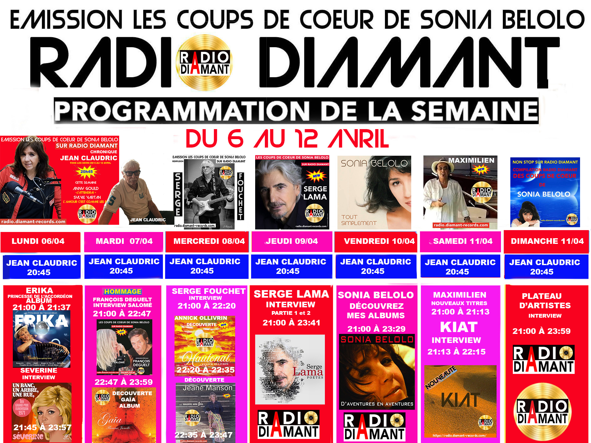 [ ÉMISSION DE RADIO SUR RADIO DIAMANT (PARIS)] ❤ "LES COUPS DE COEUR DE SONIA BELOLO"(21H) PROGRAMMATION RADIO DIAMANT DU 30 MARS AU 5 AVRIL |